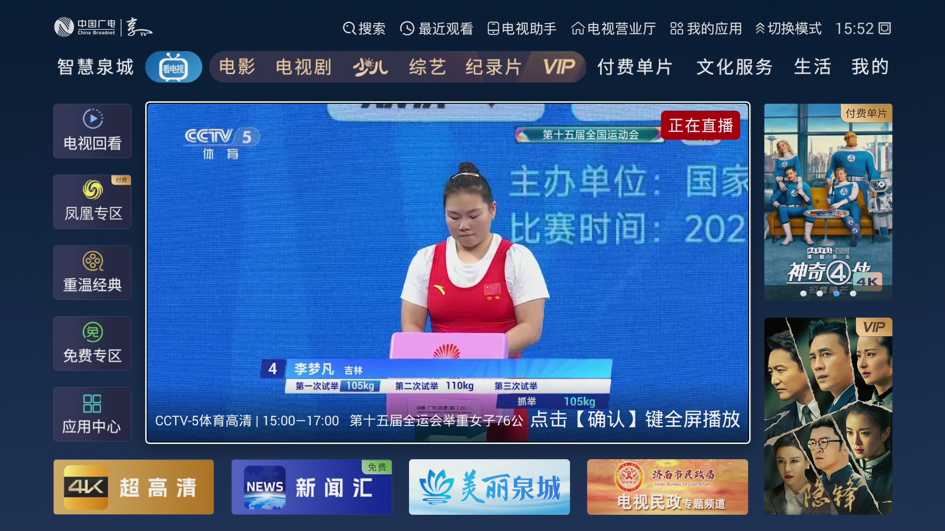 4K超高清臻享館共有十個4K頻道,頻道數(shù)量目前位于全國行業(yè)第一。在這十個4K頻道當(dāng)中,有兩個是4K直播頻道,分別是央視4K和奧林匹克頻道。還包括電影、電視劇、健身等八個4K輪播頻道。